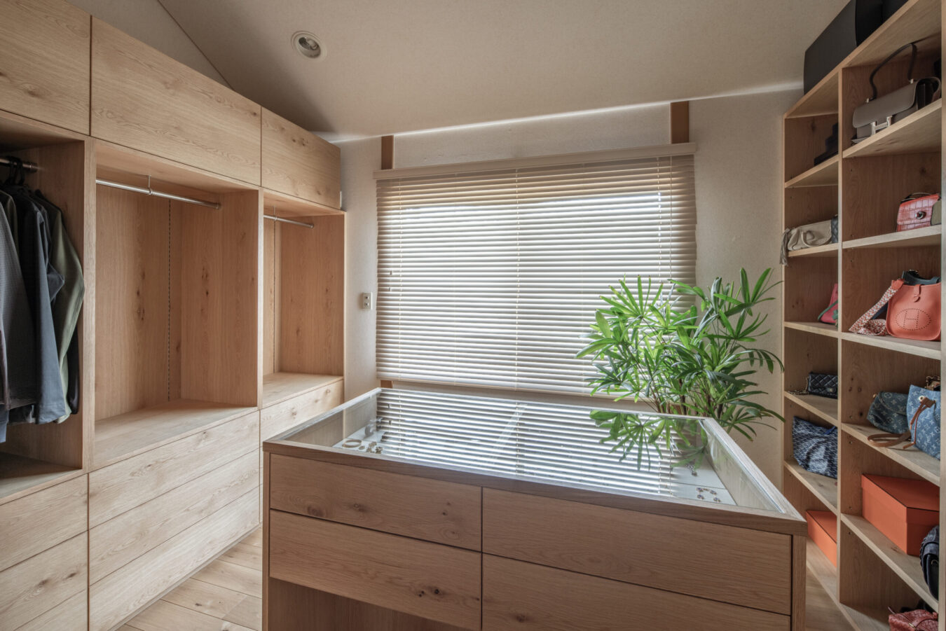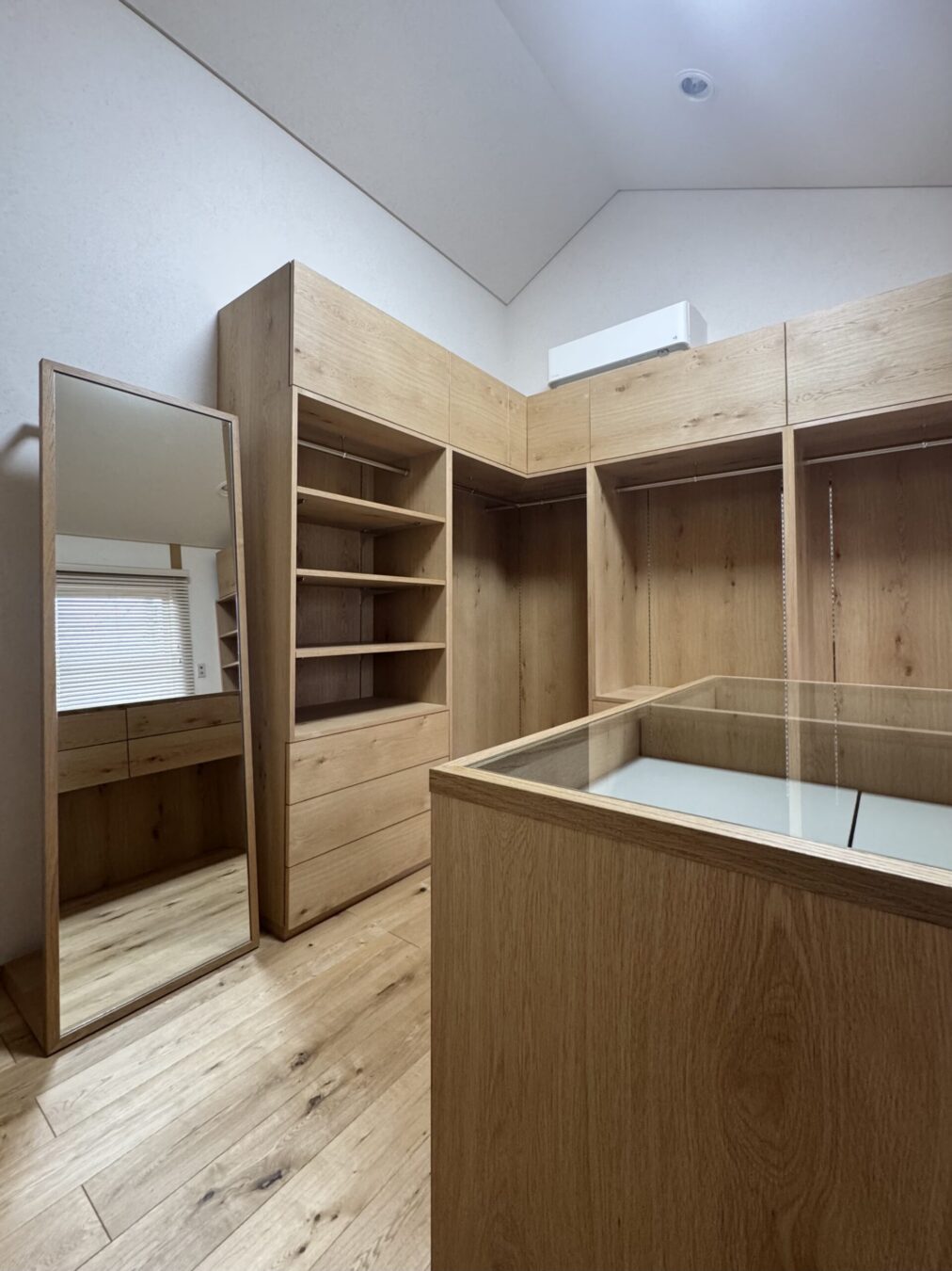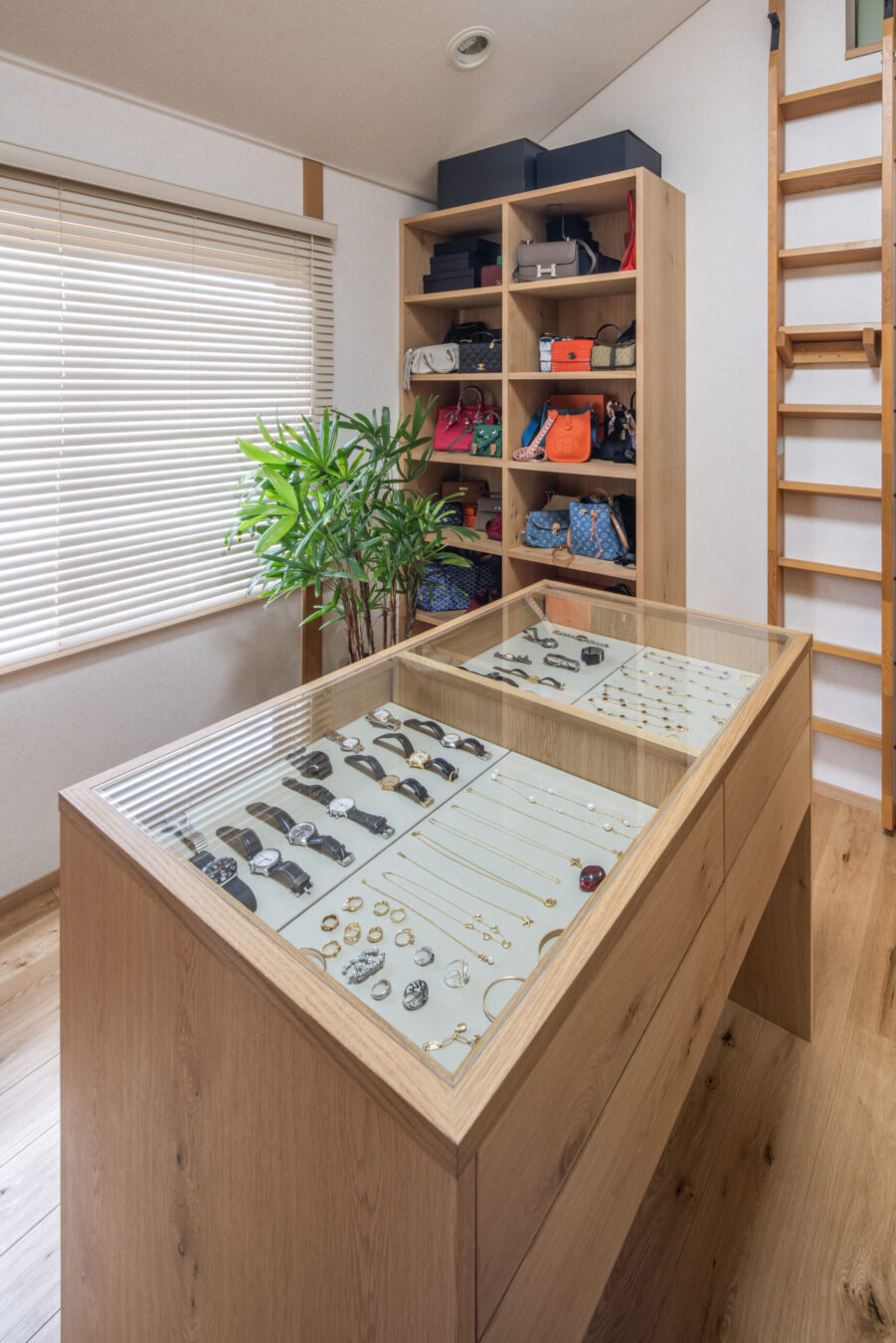 お部屋のコーナーにはカバンや帽子などが収納できるようなオープン棚と、お部屋の中央には今回の目玉であるガラスキャビネットを配置いたしました。